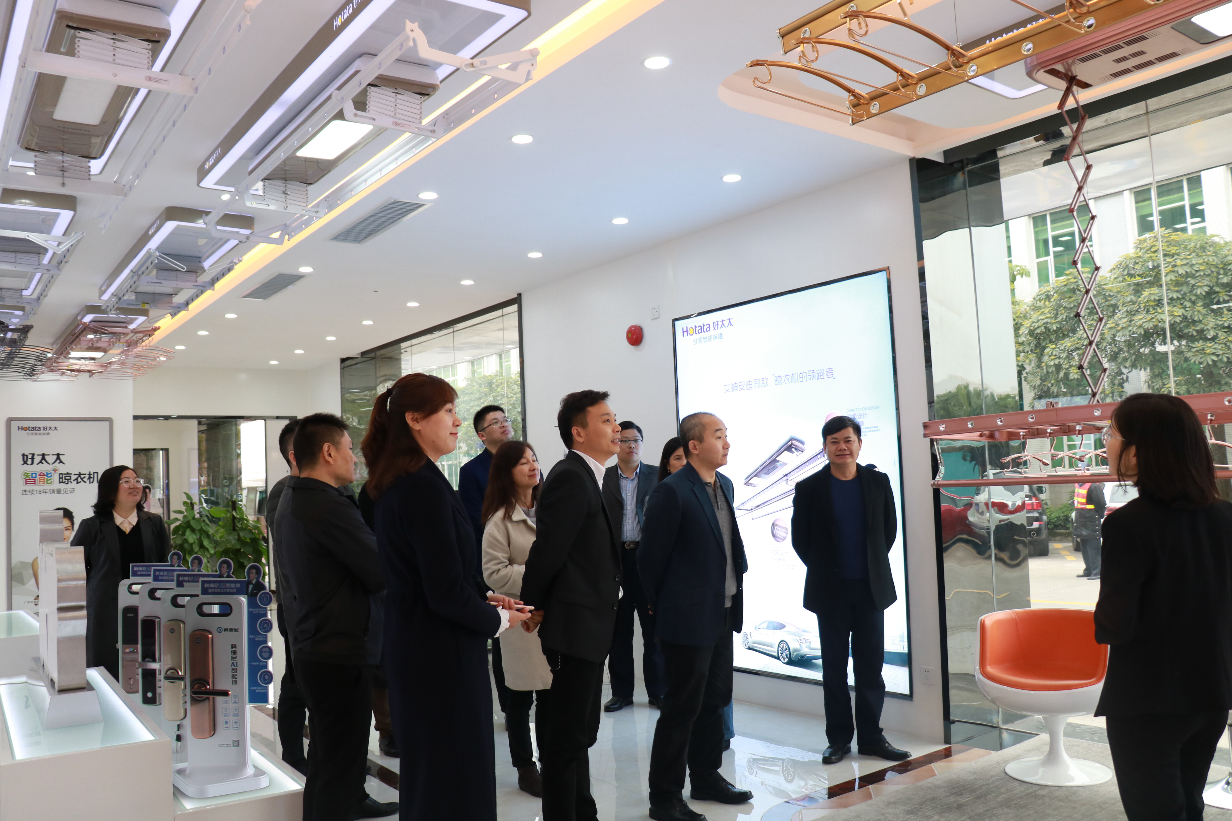 会议结束后,调研组参观了广东乐鱼集团品牌展示中心,参观过程中,由广东乐鱼集团董事长沈汉标围绕公司的核心技术产品作现场介绍讲解。随着物联网、云计算产业的蓬勃发展,以智能锁、智能晾衣机为代表品类的智能家居已成为物联网领域备受瞩目的应用。广东乐鱼集团正着力打造智慧家庭生态圈,以智能锁、智能晾衣机为拳头产品,打造智能安防、智能晾晒、智能清洁、智能交互四大板块,实现家居生活场景全覆盖。
