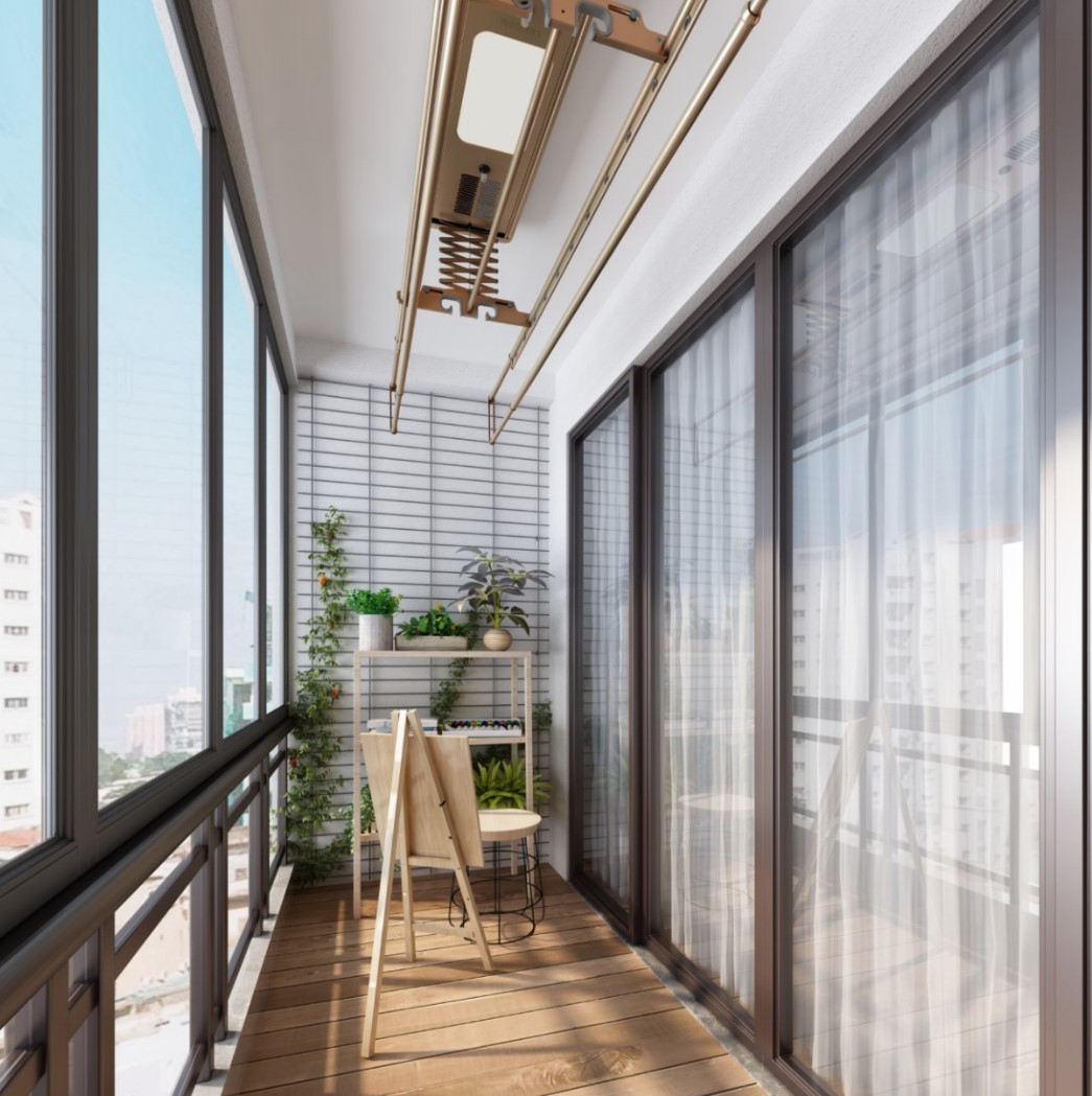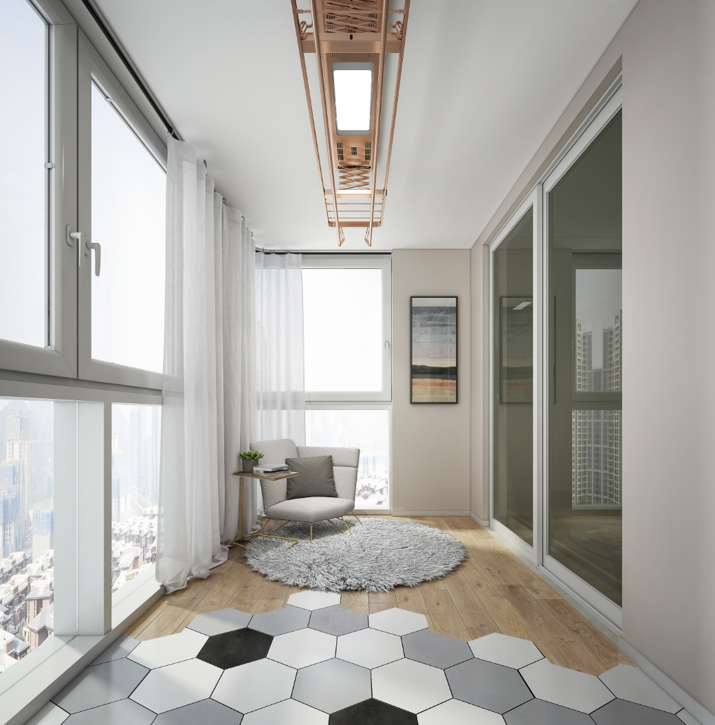 在本次金企鹅美居设计大赛中,一等奖设计师曾炎威将阳台原有的护栏,改为上部可推拉式落地窗,且不影响采光通风的条件下也保证了业主的私密性及安全感。在空间布置上以地面材料的形式划分为休闲区和工作区。休闲区地面为仿实木木纹砖,工作区域为黑、白、浅灰三种颜色的六角砖,黑白灰与原木肌理的交织使空间营造出的一种生机与美感,墙面的米黄暖色基调,融入乐鱼智能晾衣机,实用、简约,展现阳台的无限可能。