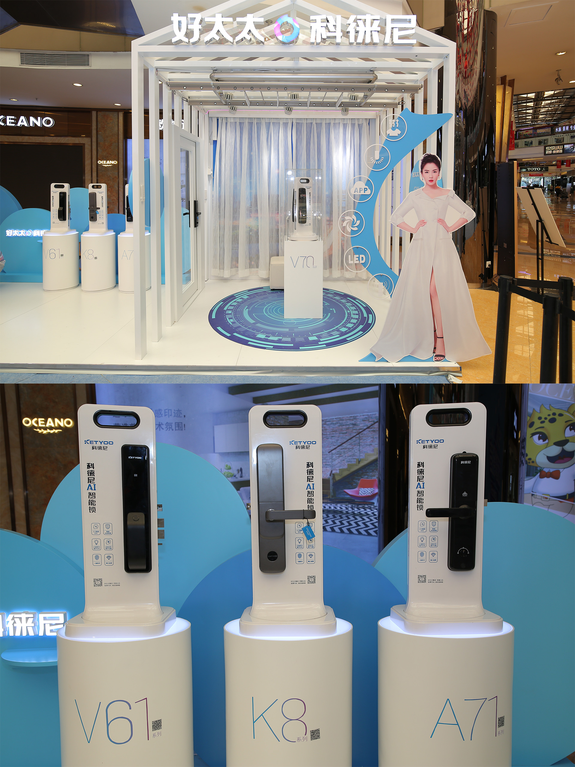 乐鱼的潮酷智能体验店,蓝白简约配色,极具未来感,智能晾衣机、智能锁、智能交互通通可进行体验,专人进行讲解,科技感满满。